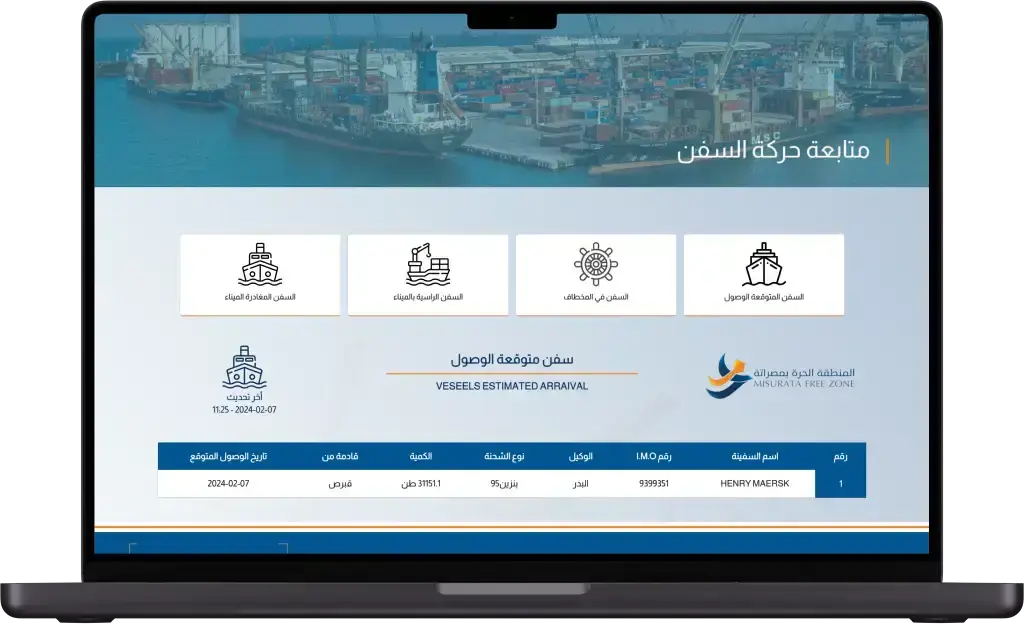 - نظام المنطقة الحرة في مصراتة هو منصة متكاملة مصممة لمركزية أنشطة الموانئ وتحسينها. من خلال توفير تتبع فوري، وتحليلات مفصلة، وواجهات استخدام سهلة، يُعزز النظام الكفاءة والسلامة واتخاذ القرارات الاستراتيجية لمشغلي الموانئ ومديري صوامع الحبوب.