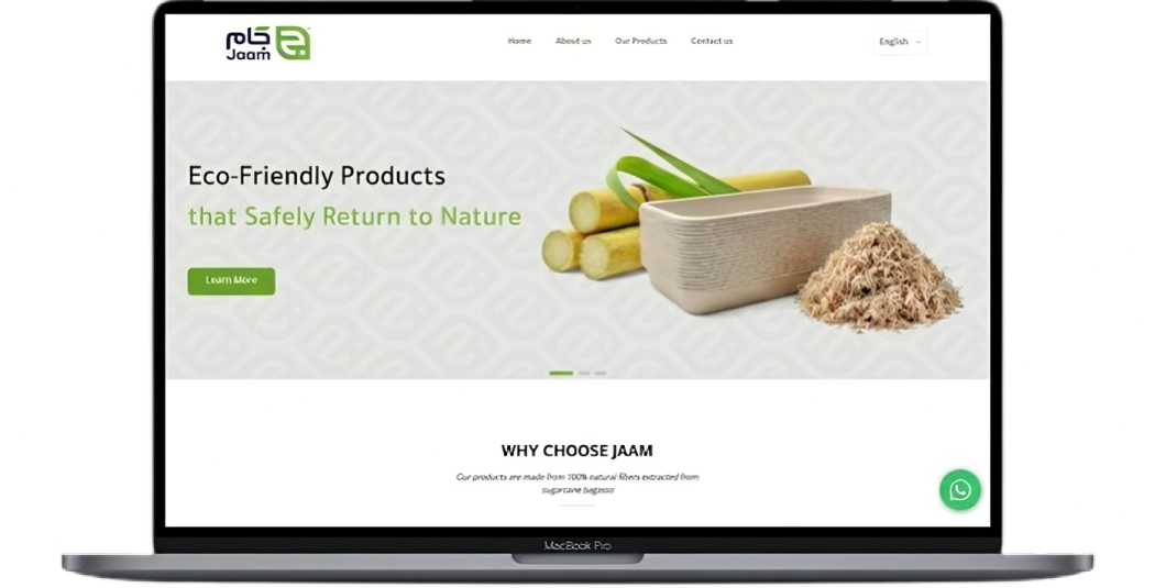 • A modern website showcasing Jaam’s eco-friendly packaging made from sugarcane fiber, highlighting innovation in green manufacturing, optimized for SEO and bilingual access.